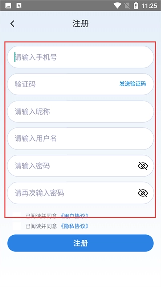 4、进入注册页面后,请按顺序填写【手机号】、【验证码】、【昵称】、【用户名】和【密码】,最后点击【注册】按钮即可完成账号创建。