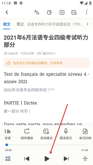3、在详情页面点击【2021年6月法语专业四级考试听力部分】选项,进入该听力内容的播放页面。