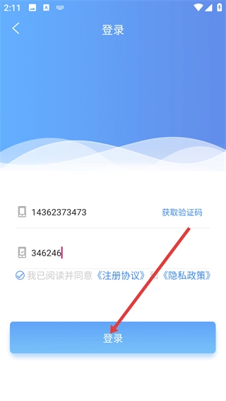 4、在登录页面,填写【手机号】-【验证码】,勾选同意【注册协议】-【隐私政策】后,点击【登录】按钮完成账号登录。