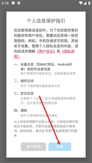 1、阅读【个人信息保护指引】,了解【用户协议】-【隐私政策】及权限说明,确认后点击【同意】按钮,即可继续使用软件服务。