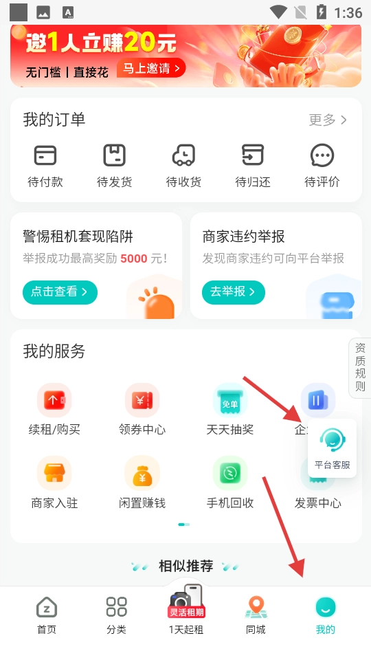 1、进入个人页面后,点击【平台客服】选项,即可进入客服中心页面。