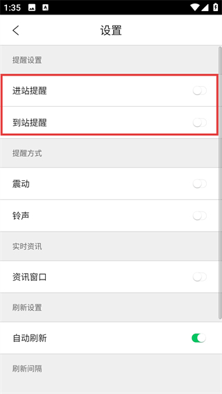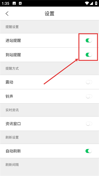 4、进入【提醒设置】页面后,找到【进站提醒】和【到站提醒】各自对应的开关按钮,点击即可启用这两项提醒功能。