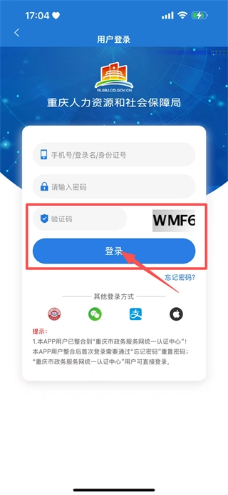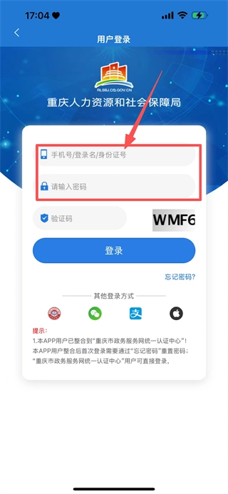 2、进入用户登录界面后,填写手机号、登录名或身份证号中的任意一项,再输入对应的密码。