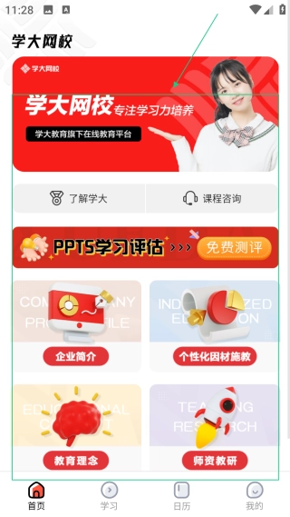 1、进入首页界面,可【了解学大、咨询课程】,获取学习相关服务。