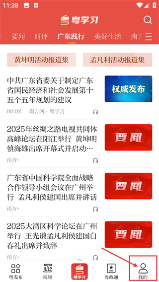 1. 进入粤学习首页(含要闻、时评等内容板块),点击底部导航栏的【我的】选项,进入个人中心页面。
