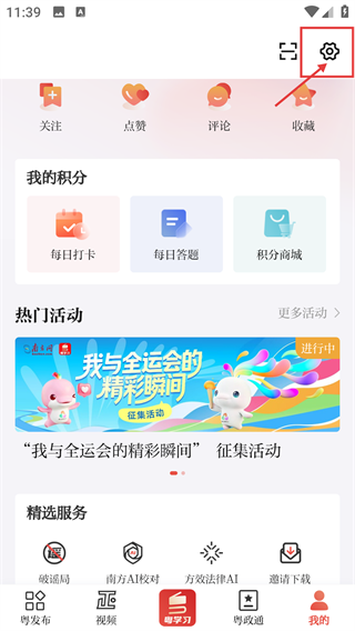 2. 在“我的”页面(含关注、点赞等功能,及我的积分模块),点击右上角的【设置】图标,进入设置界面。