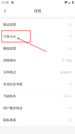 3. 在设置页面(含推送设置、播放设置等选项),点击【字体大小】选项,进入字体调整页面。