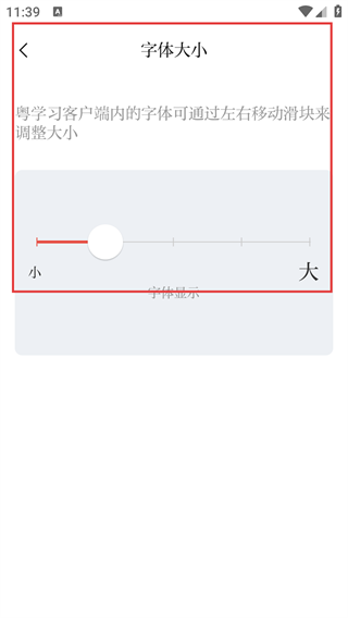 4. 在字体大小调整页面,通过左右移动滑块,即可调整粤学习客户端内的字体显示大小。