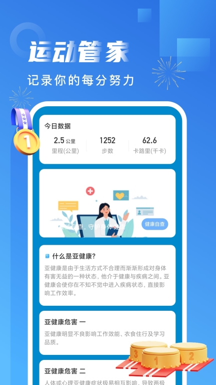 3. 助力用户合理规划运动,所有运动数据均可在软件内查询,用户可每日进行运动打卡。4平台会展示用户的各类运动相关信息,不同类型的信息对应的回馈力度存在差异。