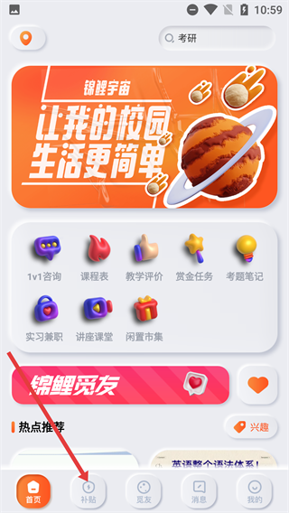 1、在【锦鲤宇宙】首页,点击底部【补贴】按钮进入对应页面,可使用【1v1咨询】-【课程表】等校园生活相关功能。