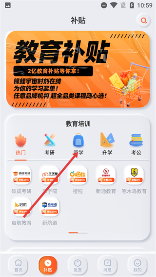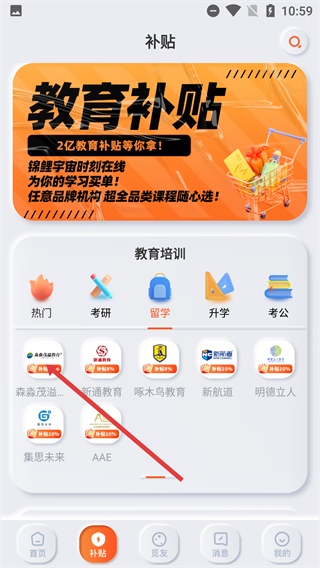 2、进入【补贴】页面,找到【教育培训】板块,点击【留学】标签,查看对应的教育机构列表。