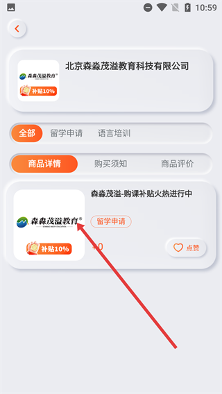 4、在【北京森淼茂溢教育科技有限公司】详情页,查看【商品详情】,可选择【留学申请】相关课程参与补贴。