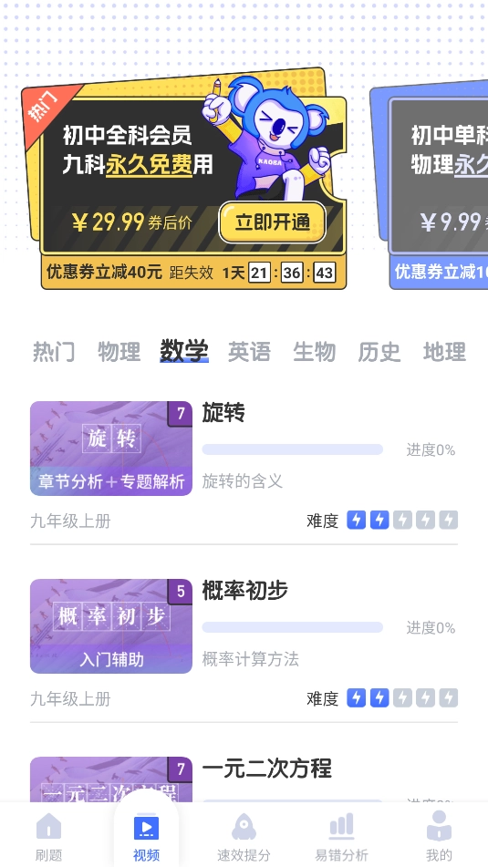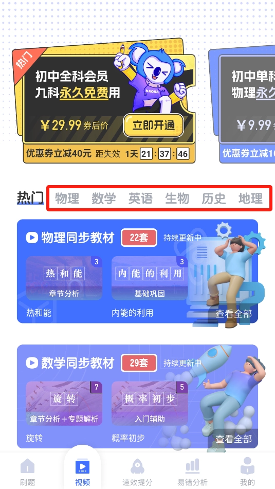 2、在视频页面,可以选择初中的各个学科进入学习。
