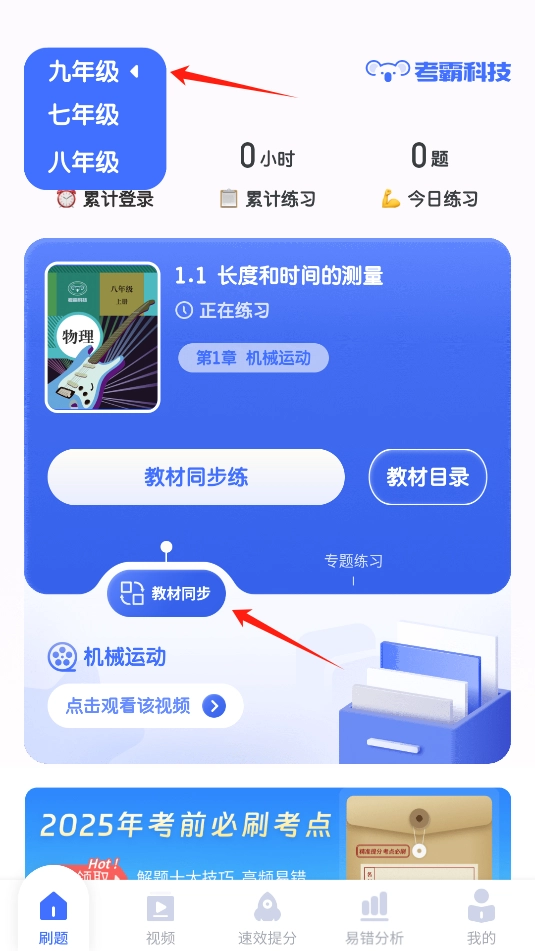 1、打开后,点击左上角的选项就能选择初中的各个年级,还可以按照课本中的教材进度进行同步学习。