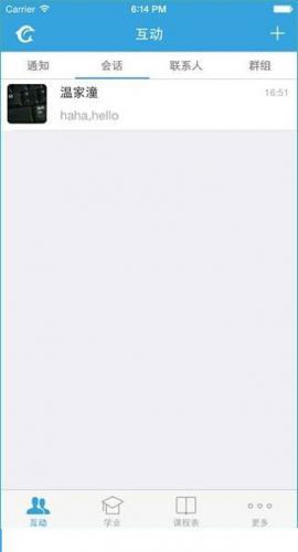 2、登陆成功后,进入互动页面,即可看到你和朋友会话的界面,同时你还可以和联系人互动,还可以群组哦。
