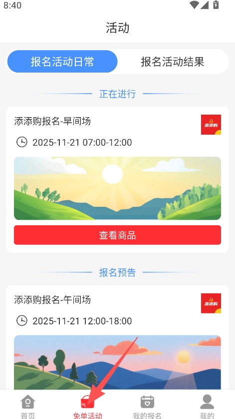 1、提供活动查看功能,进入免费活动板块,浏览正在进行及预告的多时段活动,确定参与的活动场次。