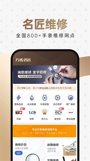 万表平台旗下的万表名匠是全国钟表维修诚信平台,它通过多维度的严格审核,筛选出诚信度高、专业性强且服务体验佳的维修店进行签约合作。截至目前,全国已有28个省份的800多家维修店加入该平台,为广大消费者提供专业可靠的手表检测、保养、维修等售后服务。