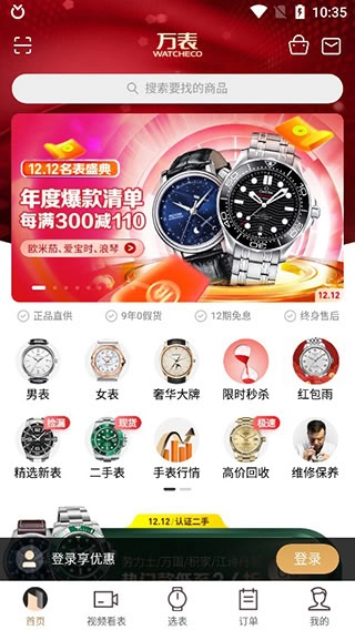 2、进入首页可浏览男表、女表、二手表等丰富类型。