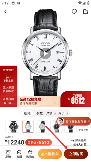 3、进入手表详情页面后,在查看完参数、评价等相关信息后,我们就可以点击【立即购买】按钮,进入到购买环节啦。