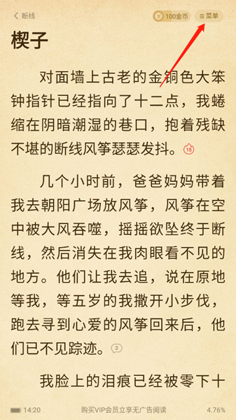 1、首先我们需要进入小说的阅读界面,在该界面点击右上角菜单按钮。