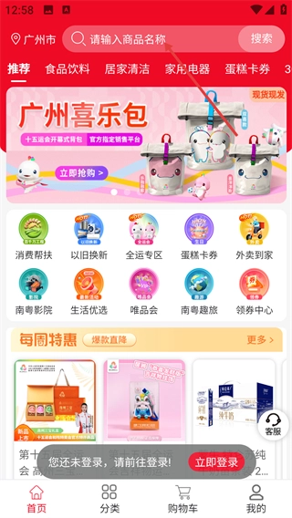 1、打开应用进入首页后,点击顶部显示“请输入商品名称”的搜索框,即可激活输入功能,为搜索商品做准备。
