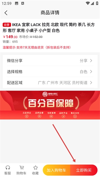 4、进入商品详情页面,确认商品信息无误后,点击页面底部的【加入购物车】按钮,即可把该商品添加到购物车中。