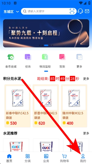 1、打开聚材通商城,点击底部我的,进入我的页面。