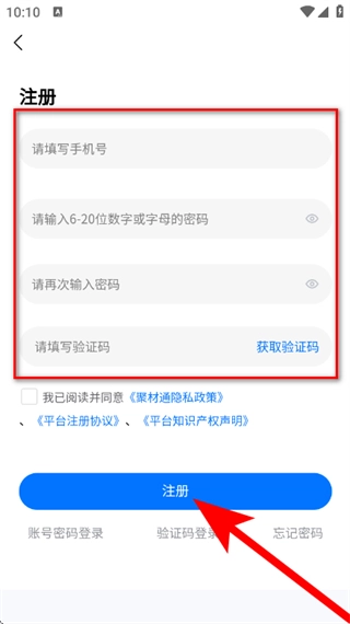 4、在注册页面,填写手机号等信息,获取并填写验证码,勾选协议后,点击注册,完成账号注册。