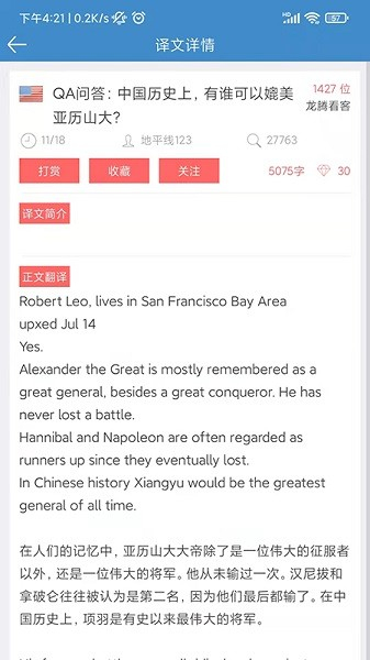 3、网帖翻译平台支持龙币兑换,也能选择查看某一译者的所有译文。