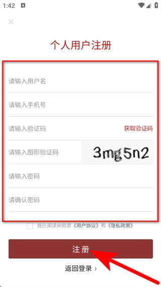 4、填写用户名,输入验证码,设置并确认密码,勾选相关选项后,点击注册按钮。
