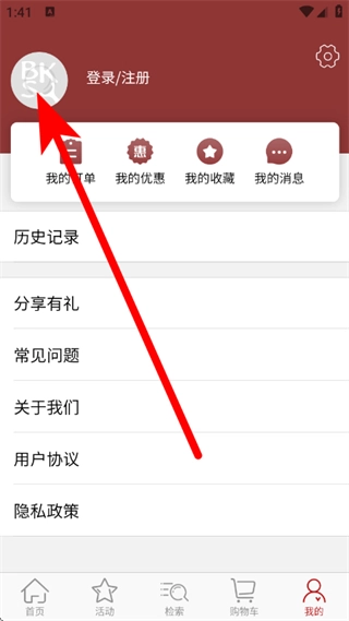 2、在我的页面,点击登录注册区域,进入登录页面。