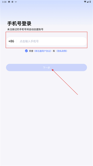 在登录环节,阅读《新石器用户协议》和《隐私政策》后,点击【同意并继续使用】按钮,即可返回手机号登录界面。