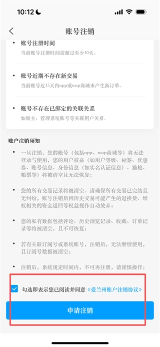 5、进入账号注销页面,勾选相关协议后点击申请注销按钮,即可完成账号注销操作。