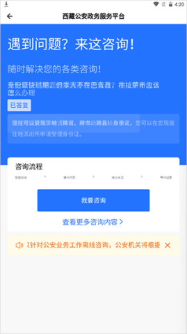 西藏公安政务服务的使用体验堪称一绝!它有着极为简洁直观的操作界面,各类核心功能清晰呈现。只需简单几步操作,就能顺利完成各项办事流程。此外,应用内还提供了详尽的办事指引,涵盖所需材料、相关机构信息等内容,贴心程度让人赞不绝口。遇到问题时,在线服务团队随时待命为你答疑解惑,妥妥是解决燃眉之急的得力帮手。