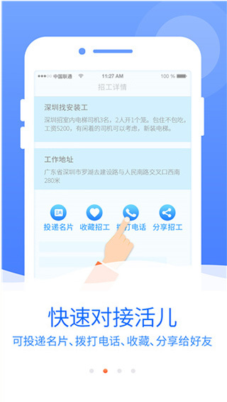 3、平台汇聚海量招工与找活信息,每日实时更新,涵盖各类岗位需求,无论您想寻找何种类型的工作,都能在这里找到合适的机会。