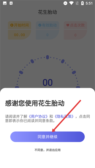 1、打开【花生胎动】后会弹出提示,需阅读【用户协议】与【隐私政策】条款,点击【同意并继续】按钮,就能进入应用的功能界面。
