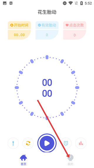 2、进入【花生胎动】首页后,能看到【开始时间】-【有效胎动】等数据模块,点击底部的【我的】按钮,即可进入个人相关操作页面。