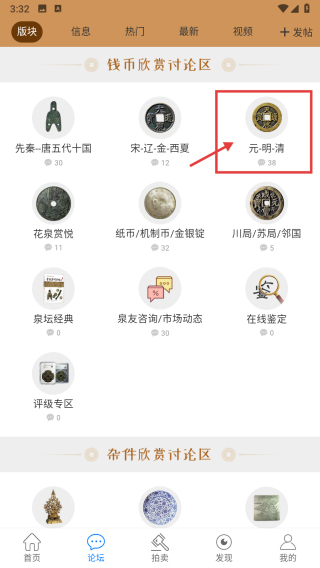 2在论坛界面中,找到并点击元明清相关的板块入口,即可进入该时期钱币的交流与品鉴专区。