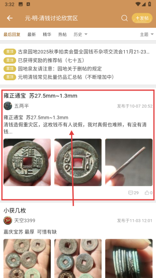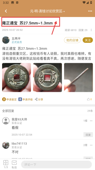 4、进入帖子详情页后,就能看到这枚雍正通宝的相关讨论、图片以及藏友之间的鉴定交流信息。