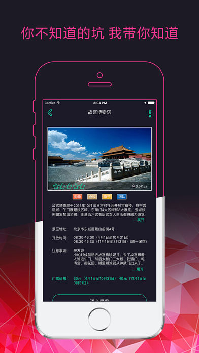定位页完整呈现景区地图,会依据你的所在位置自动为你挖掘景点的相关信息,各类奇闻轶事都不会遗漏,比如那些你未曾听闻的故事,还有故宫里流传的野史。