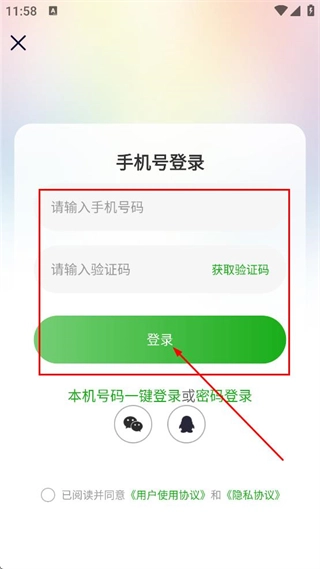 4、进入登录界面后,依次输入手机号码与验证码,随后点击登录按钮,即可完成登录流程。