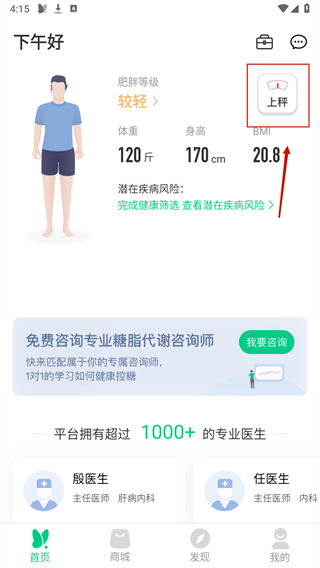 2、开启蓝牙后,点击主页面右上角的上秤按钮,即可连接秤并获取你的相关数据。