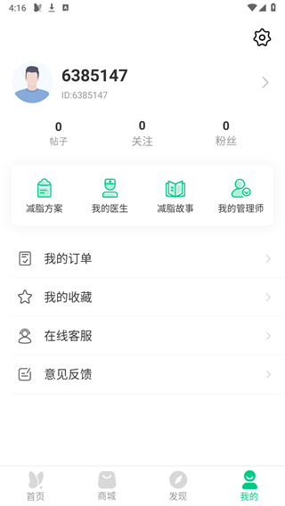 4、在主页面下方的“我的”板块中,可查看个人相关内容,包括我的减肥方案、我的医生、减肥故事、我的管理师等。