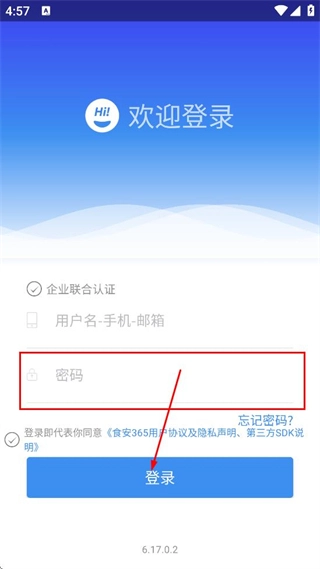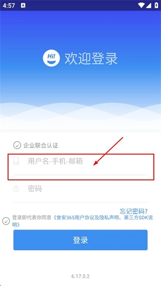 2、进入食安365的登录页后,在用户名-手机-邮箱,填写对应的账号信息。