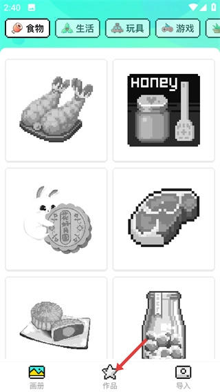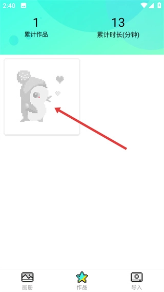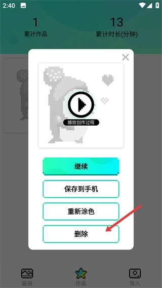 2、进入【作品】页面后,点击已完成的像素作品,会弹出功能操作菜单。