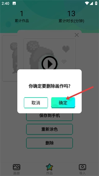 4、点击【删除】选项后,系统会弹出【你确定要删除画作吗?】的确认提示框,此时再点击【确定】按钮,即可完成画作的删除操作。