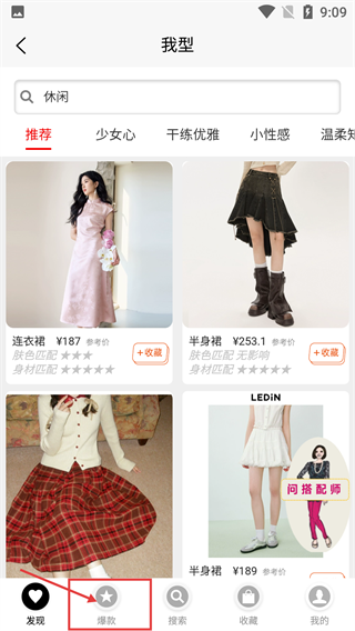 3、进入【我型】推荐页面后,点击底部的【爆款】按钮即可浏览热门服饰,同时也能借助顶部的标签来筛选不同风格的穿搭选择。
