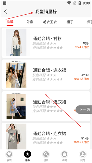 4、进入【我型销量榜】页面,找到【通勤合辑】类服饰板块,结合销量情况与风格匹配度筛选合适的穿搭,若当前页面内容不足,可点击“下一页”浏览更多相关推荐。
