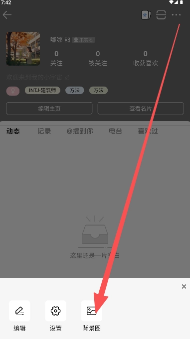 1、在个人主页点击右上角的三点图标,待弹出界面后选择“背景图”选项。