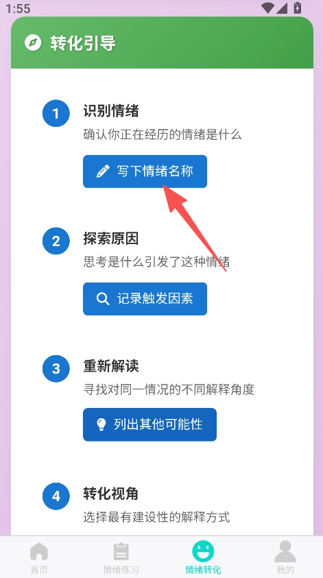 3、配备转化引导机制,引导用户分步骤完成情绪识别、记录触发因素等操作,以推动情绪调节流程的开展。